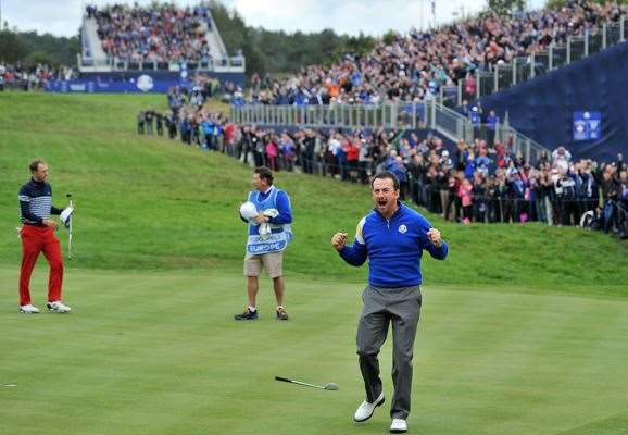 Germany’s Martin Kaymer received a rowdy applause from the crowd after a dramatic chip-in for eagle on the 16th to complete his win over Bubba Watson, pushing Europe’s lead to 13-7, needing just one more point to secure the victory.
